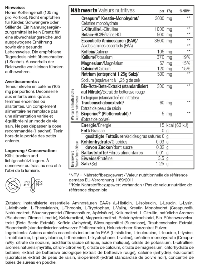 Folate, magnesium, niacin, pantothenic acid, riboflavin, vitamin B12, vitamin B6, vitamin C contribute to reducing tiredness and fatigue, pantothenic acid to normal mental performance and zinc to normal cognitive function.*